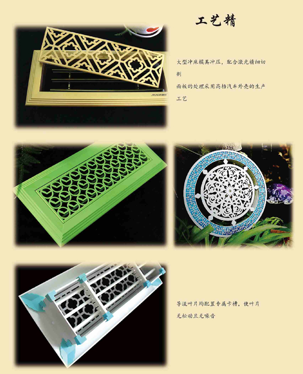 藝術(shù)風(fēng)口藝術(shù)百葉風(fēng)口藝術(shù)裝飾的詳細(xì)頁(yè)面。訂貨號(hào):藝術(shù)風(fēng)口,貨號(hào):土豪金,種類(lèi):百葉式風(fēng)口,用途:出風(fēng)口,材質(zhì):環(huán)保鍍鋅板,形式:單層,品牌:順智,型號(hào):仿古銅色,是否跨境貨源:否,規(guī)格:可定制。我公司專(zhuān)業(yè)設(shè)計(jì)制造各類(lèi)藝術(shù)風(fēng)口,高端酒店及別墅豪華藝術(shù)風(fēng)口,顏色款式客根據(jù)客戶(hù)要求定制,可大規(guī)模批量生產(chǎn)可承擔(dān)現(xiàn)場(chǎng)安裝。