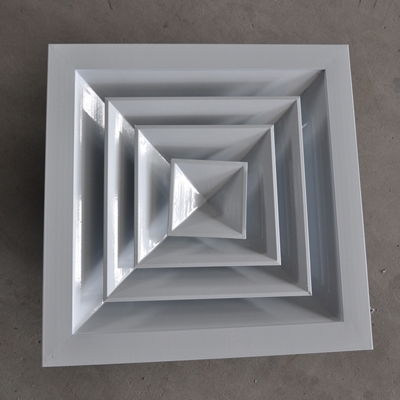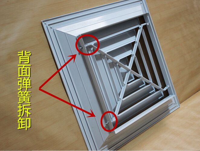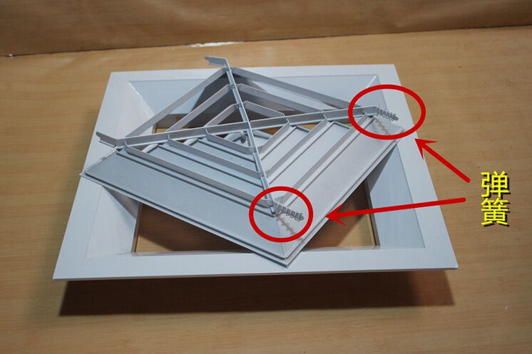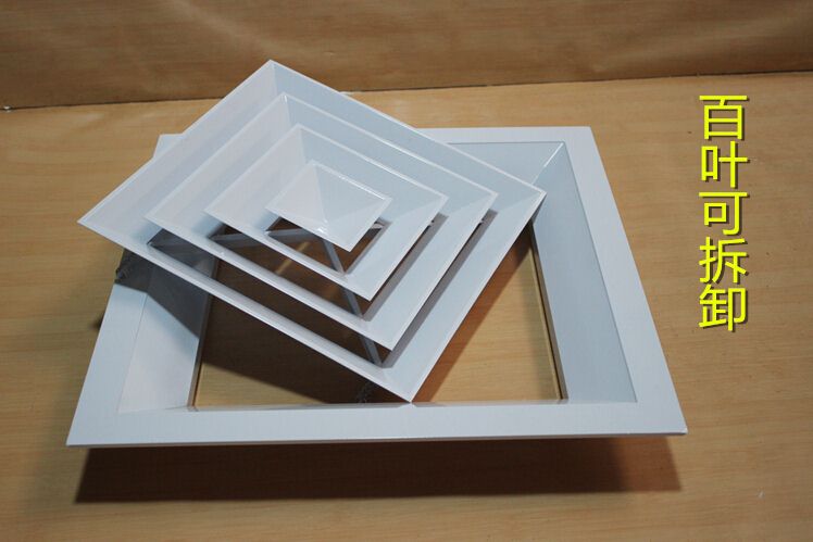 方型散流器使用該類型散流器時要與調節閥配合使用,才能在系統中得到理想的氣流分布。此風口的葉片角度為固定式,不能隨意調節,整個葉片與邊框采用分離結構